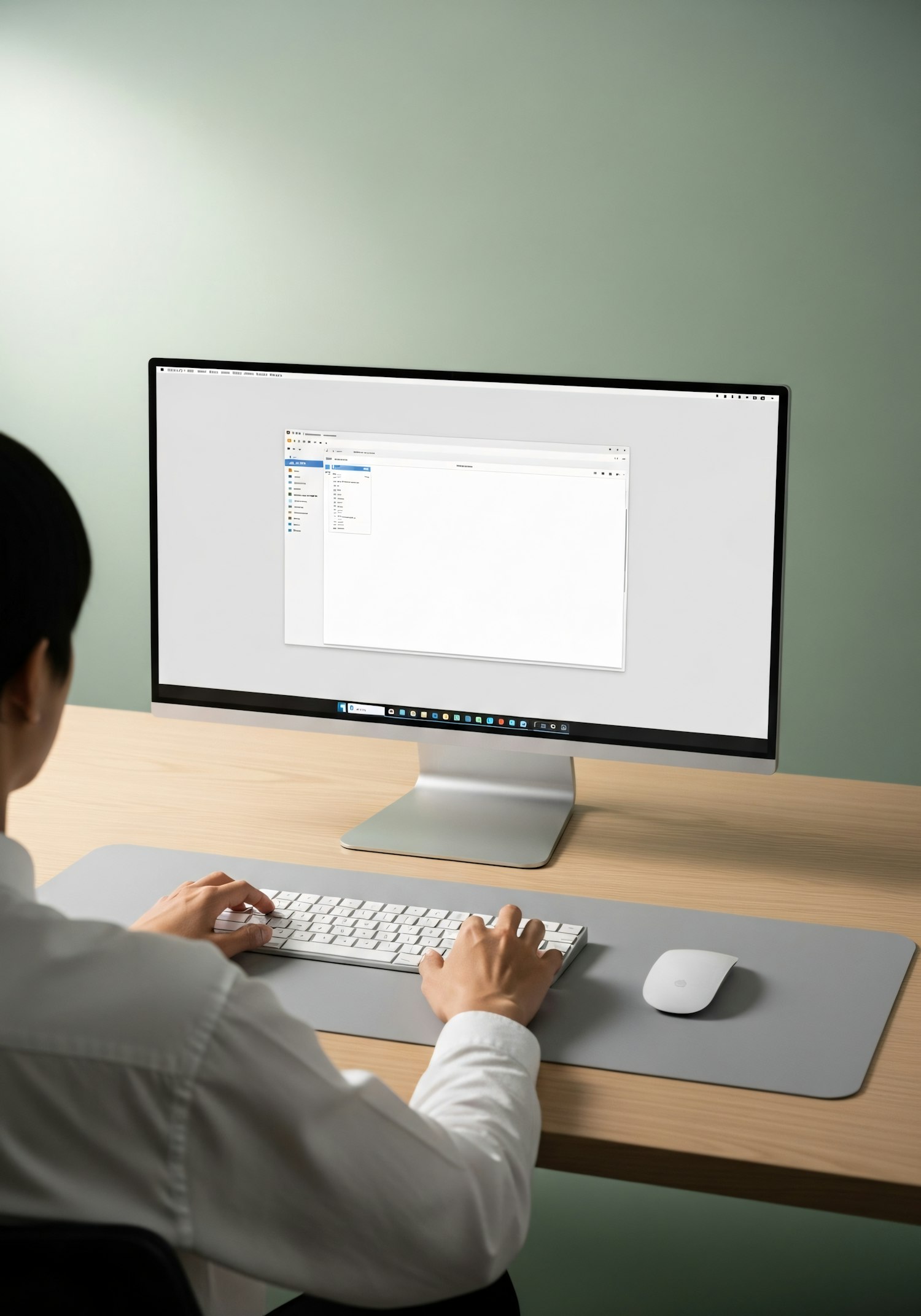 Person working at a desk with a modern computer setup, featuring a sleek monitor, white keyboard, and mouse on a wooden desk.