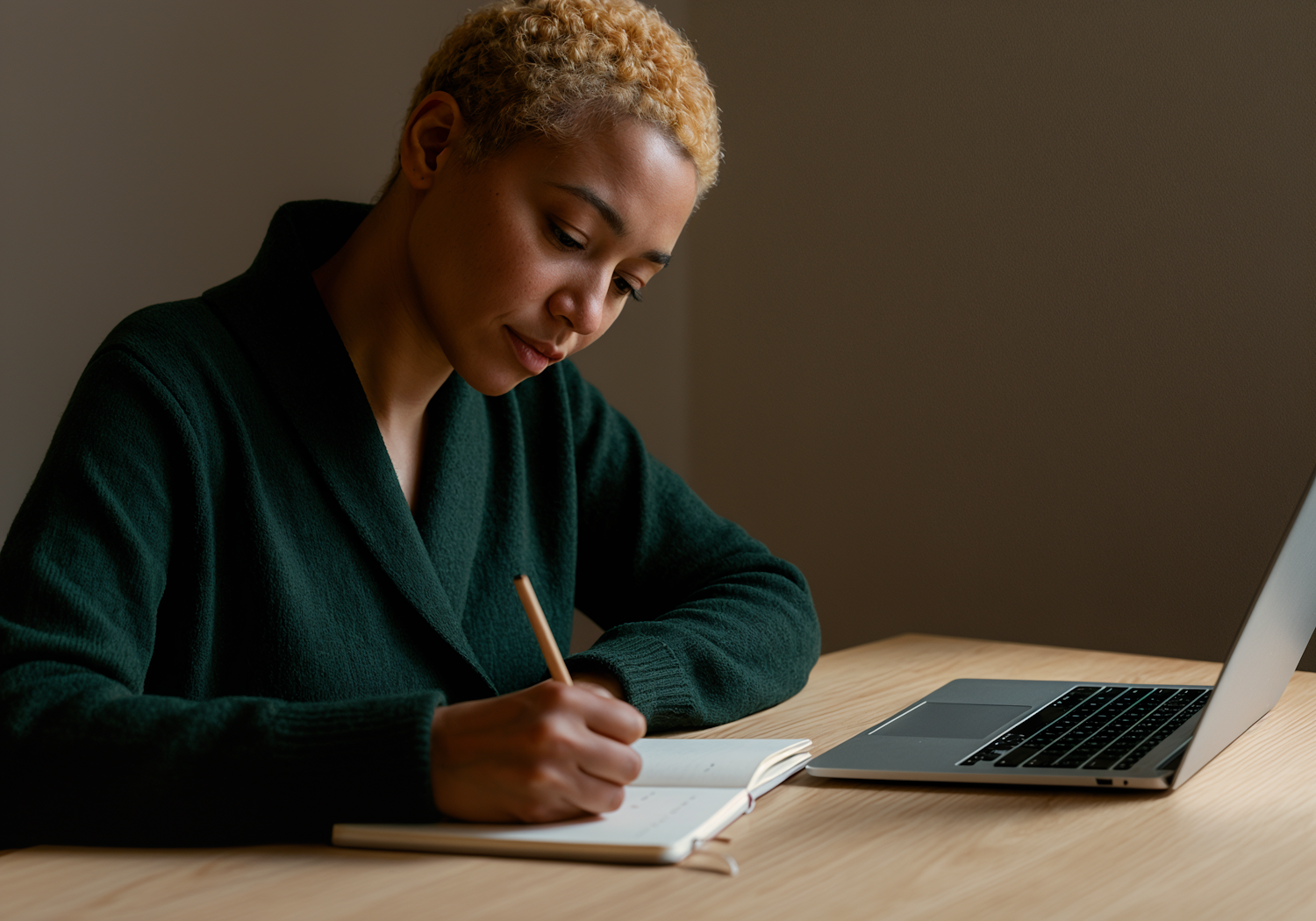 A focused individual writing in a notebook at a desk with a laptop, creating a serene and productive workspace vibe.