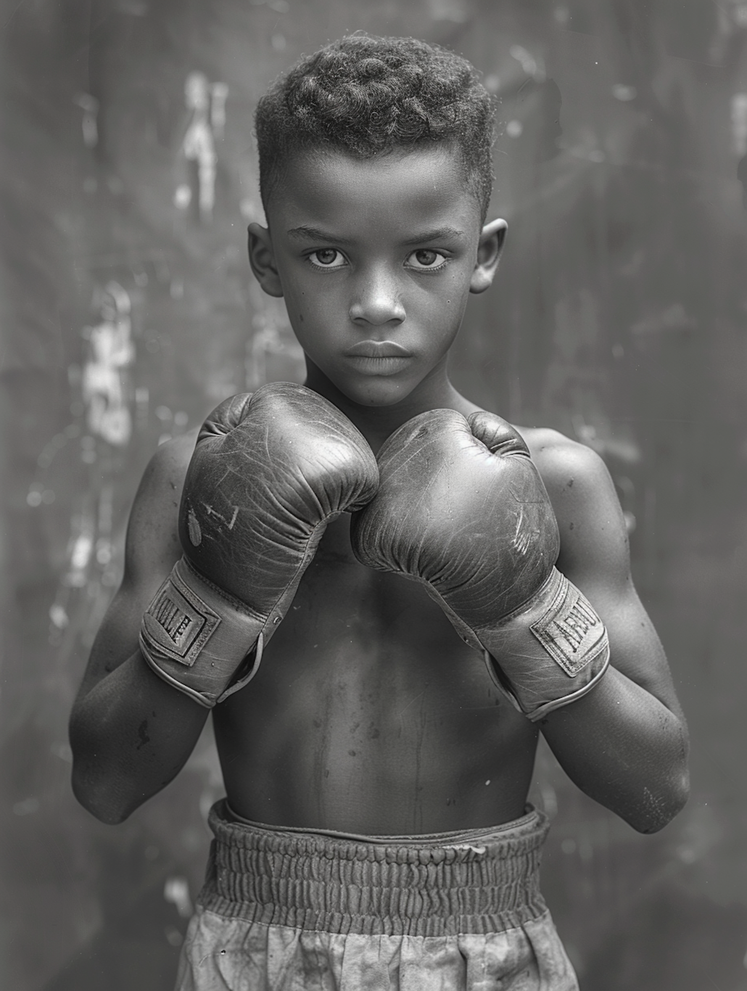 Young Black boy with boxing gloves, focused expression, and strong posture, embodying determination and readiness.