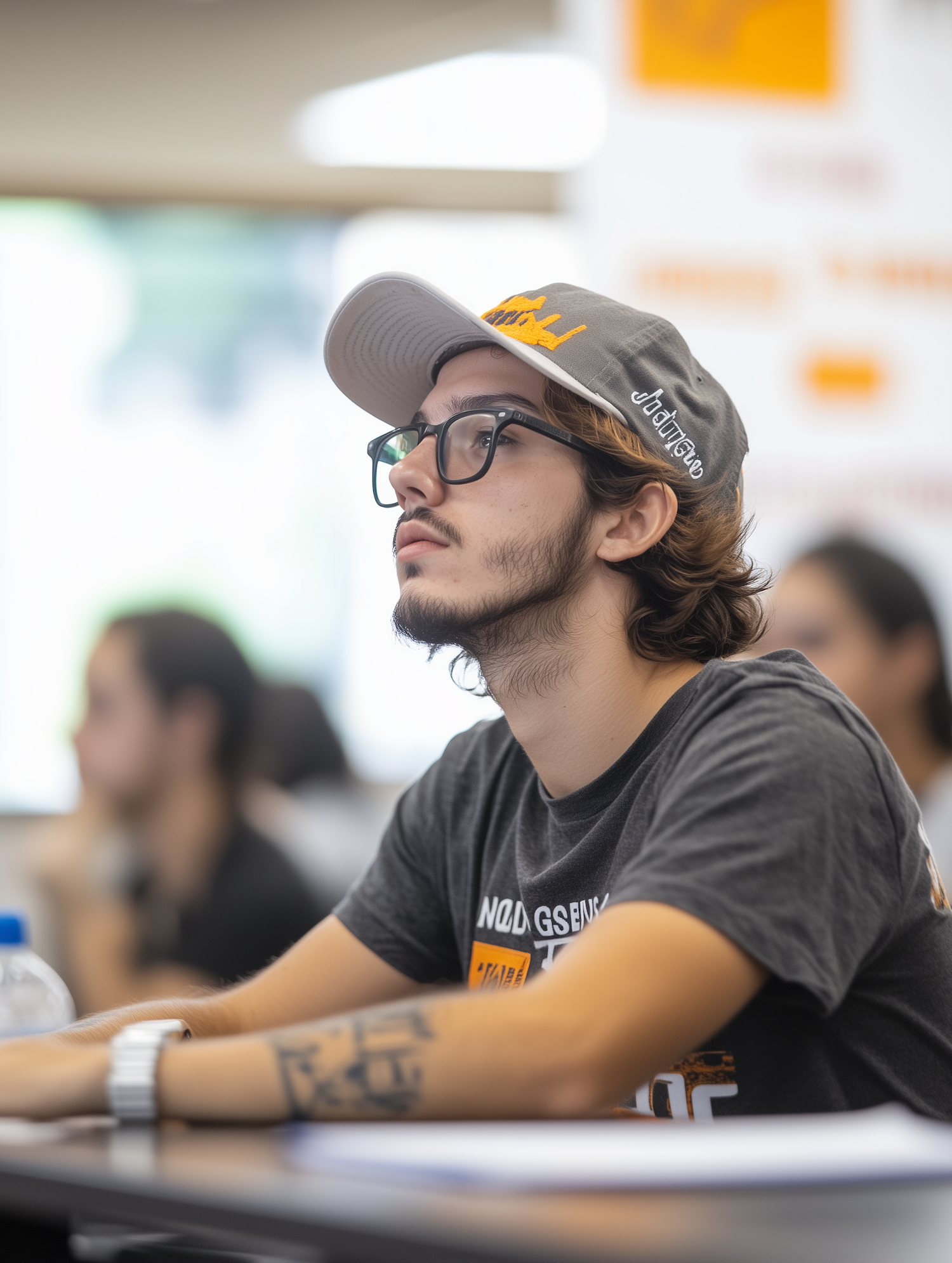 Young man in a cap and glasses attentively listens in a classroom setting, showcasing focus and casual style.