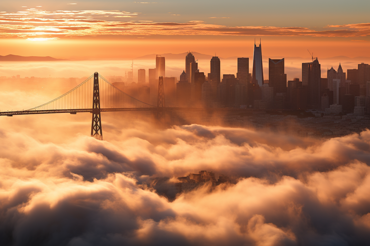 Fog-Enshrouded Sunrise over Cityscape with Bridge