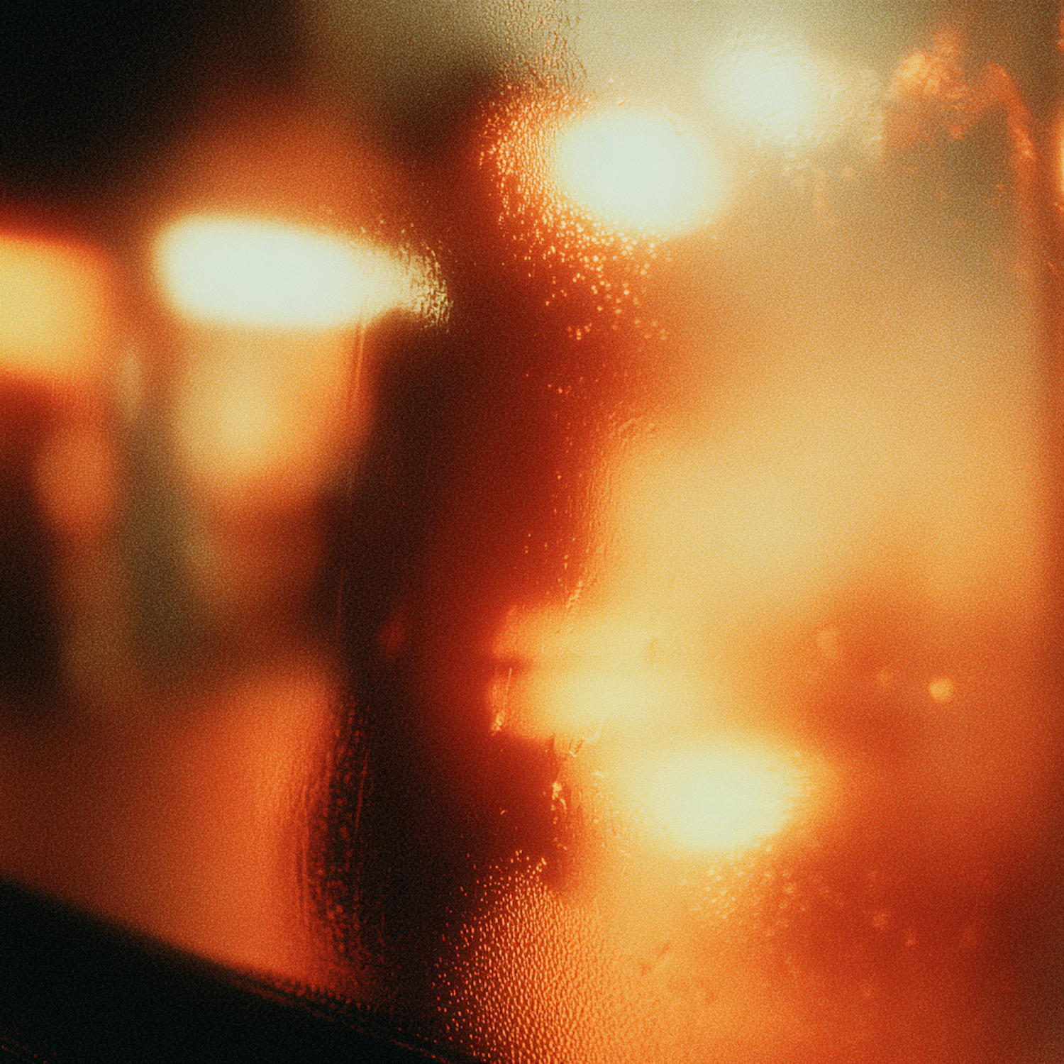 A fogged glass surface with warm, diffused light sources, creating a cozy and abstract visual effect with textured condensation.