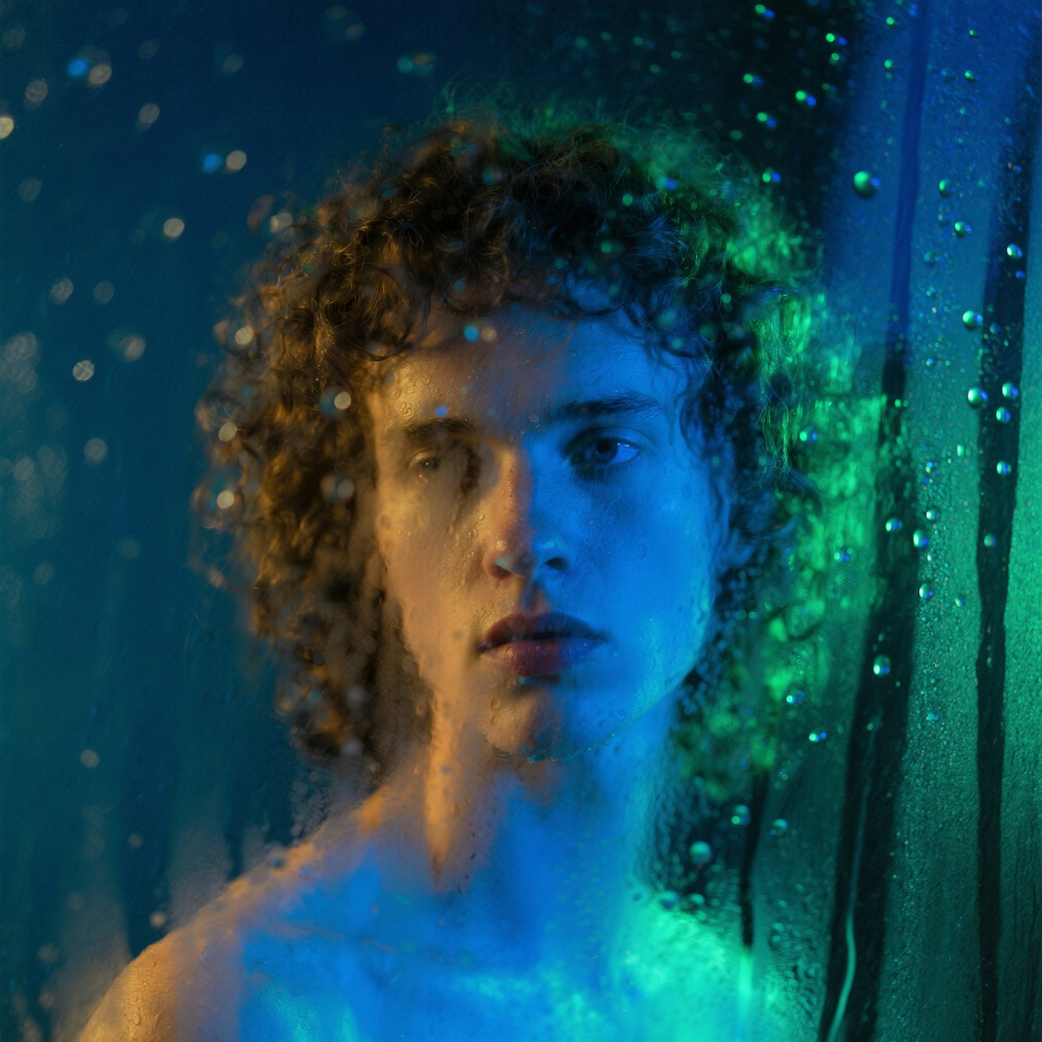 Artistic portrait of a person with curly hair seen through fogged glass, illuminated by vibrant blue and green lighting.