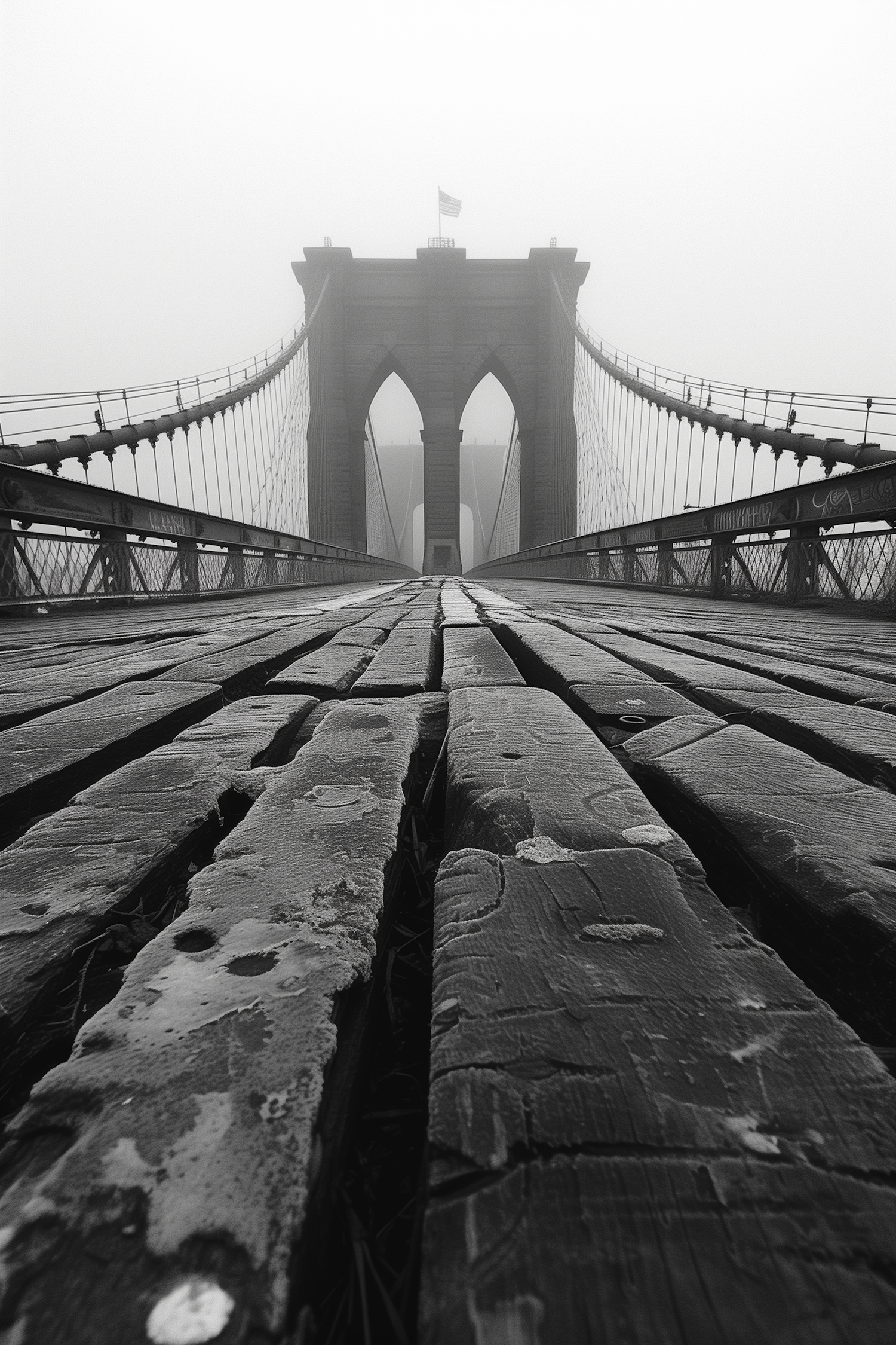 Moody black and white photo of Brooklyn Bridge in fog, highlighting weathered planks and iconic arches.