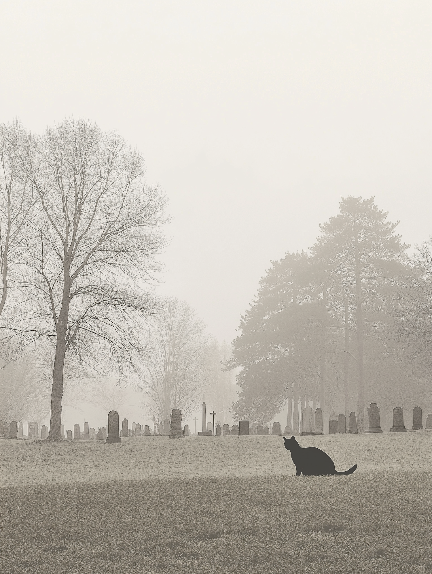 Misty cemetery with a black cat silhouette, gravestones, and leafless trees creating an eerie, mysterious atmosphere.