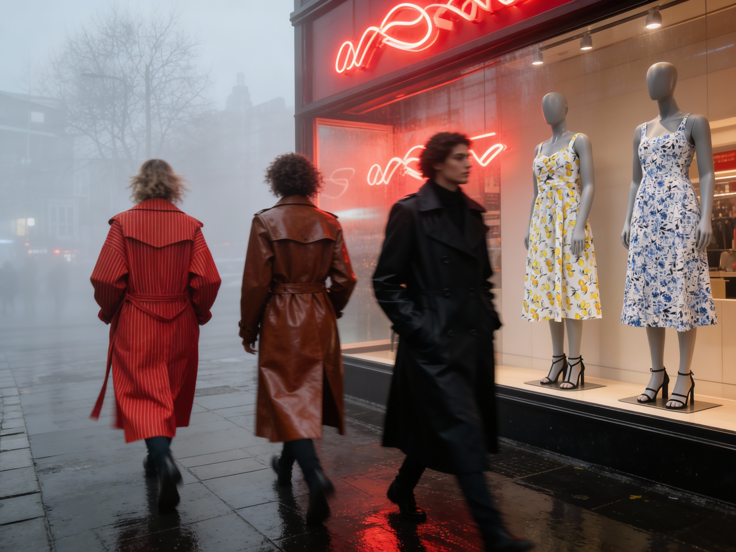 Stylish individuals in trench coats walk past a neon-lit storefront with mannequins in floral dresses on a foggy city street.