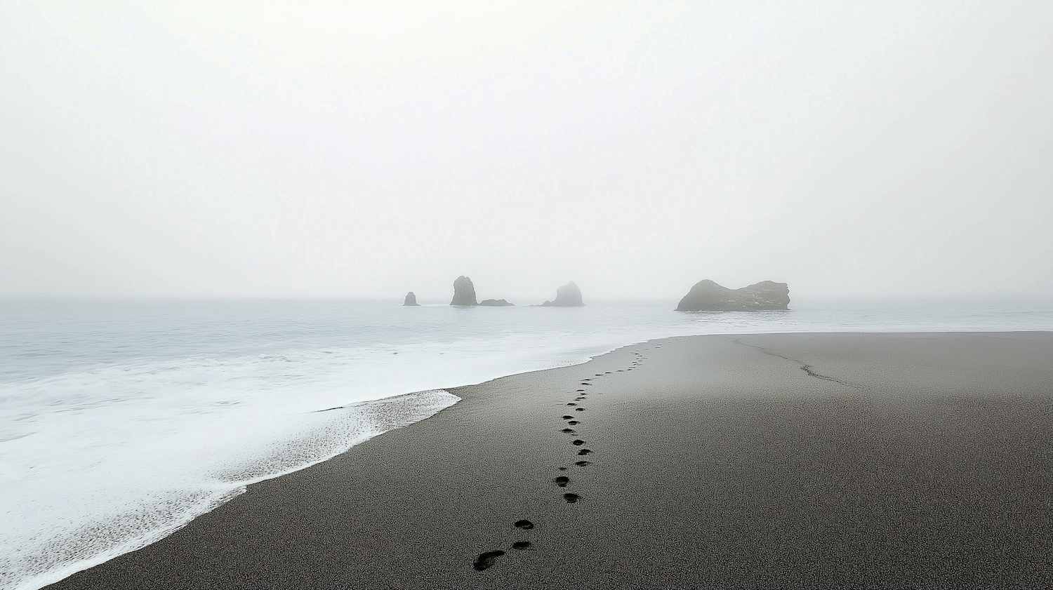 Foggy beach with footprints on dark sand leading to the ocean, distant rock formations, and soft waves creating a tranquil atmosphere.
