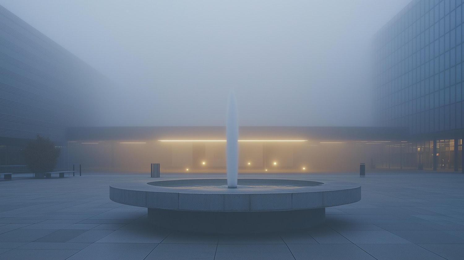 A foggy courtyard with a minimalist fountain, modern buildings, and soft lighting creating a tranquil, mysterious atmosphere.