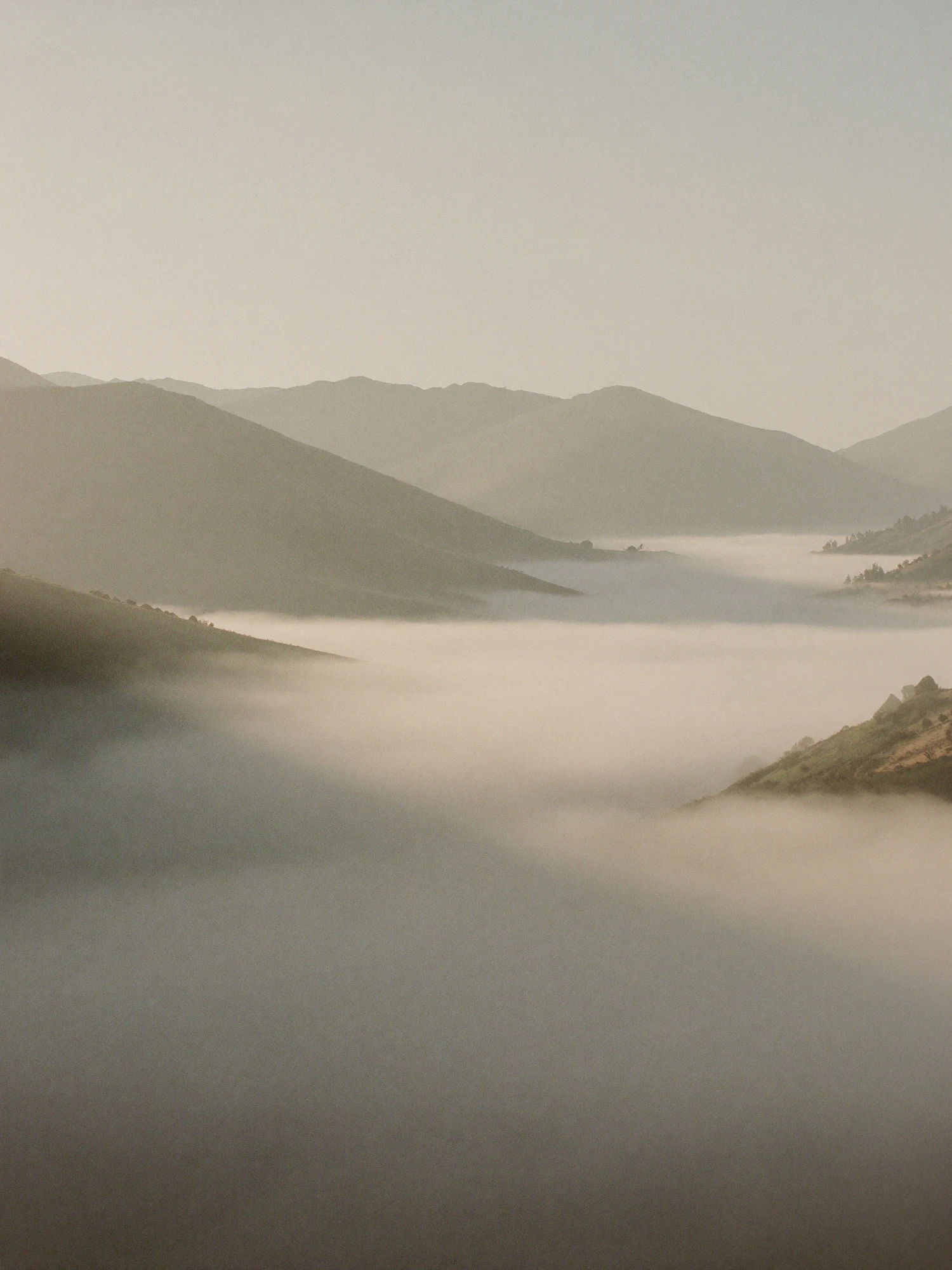 A tranquil view of fog-covered valleys and rolling hills under a clear sky, showcasing nature's serene beauty.