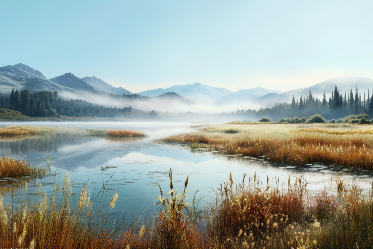 Tranquil lake with golden grasses, misty mountains, and pine trees under a clear blue sky. A serene and peaceful landscape.