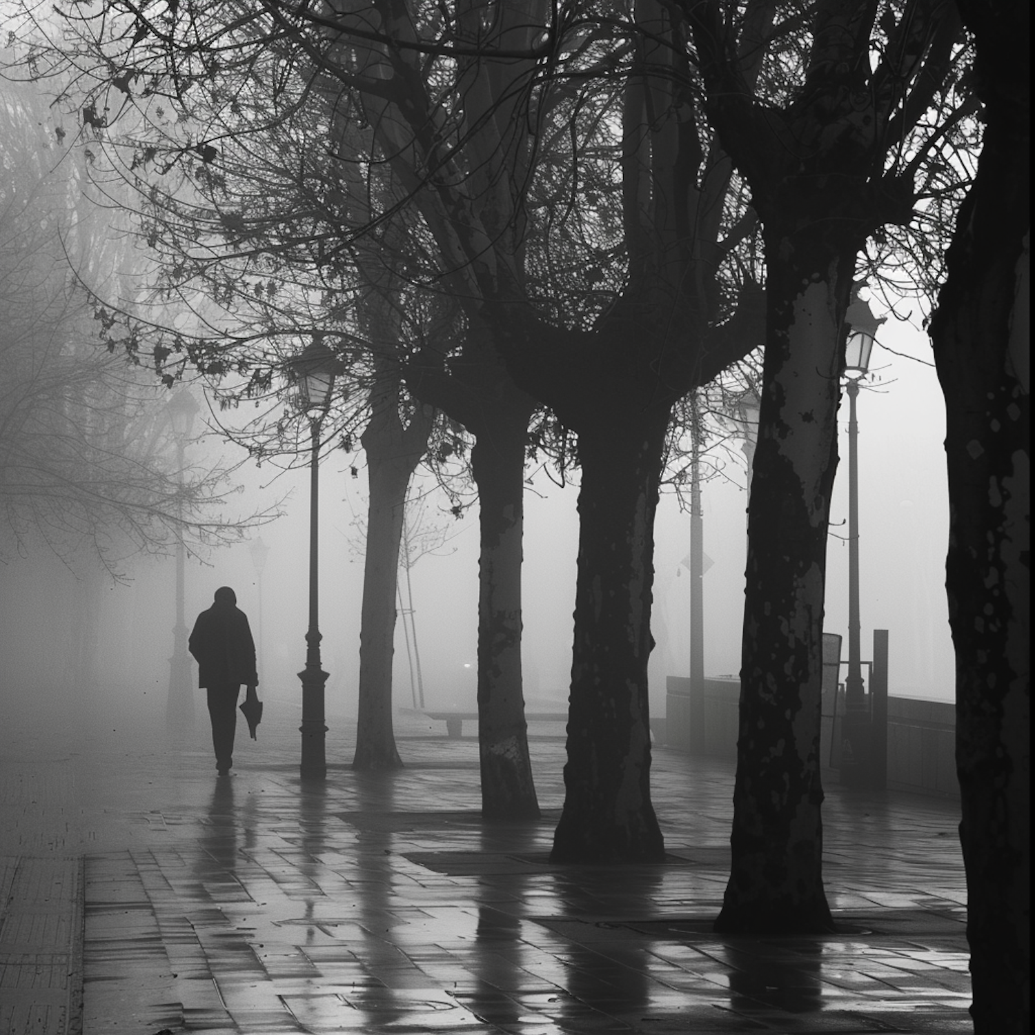 A lone figure walks on a foggy, tree-lined path, creating a mysterious and introspective atmosphere.