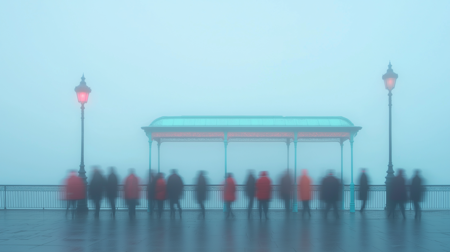 Foggy promenade with blurred figures, vintage lamps, and a teal-roofed pavilion. Misty, ethereal atmosphere with glowing red lights.