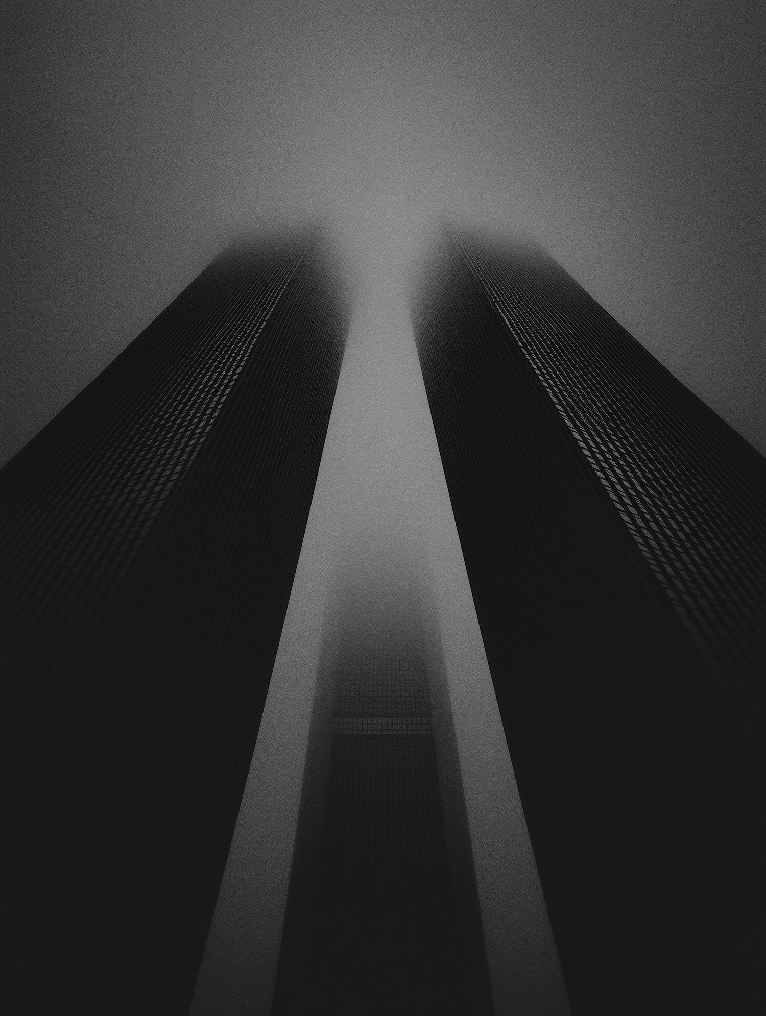 Three skyscrapers rise into dense fog, their tops obscured. A dramatic, mysterious scene with a muted gray and black color palette.