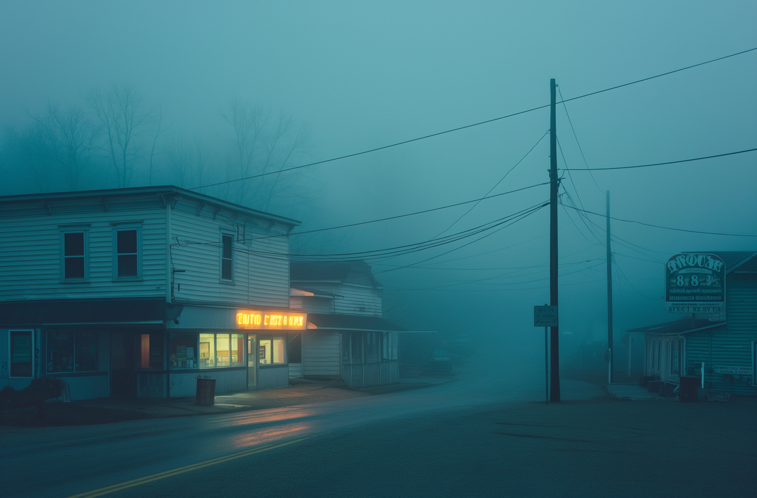 Foggy small-town street at night with glowing neon signs, vintage buildings, and eerie blue-green mist creating a cinematic atmosphere.