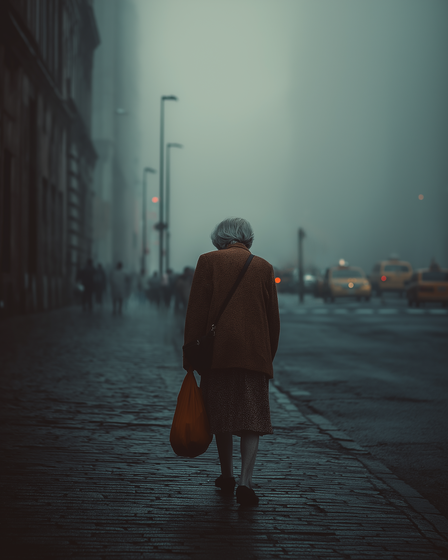 Elderly woman walking alone on a foggy city street, carrying an orange bag. Moody urban scene with cobblestone pavement and distant taxis.