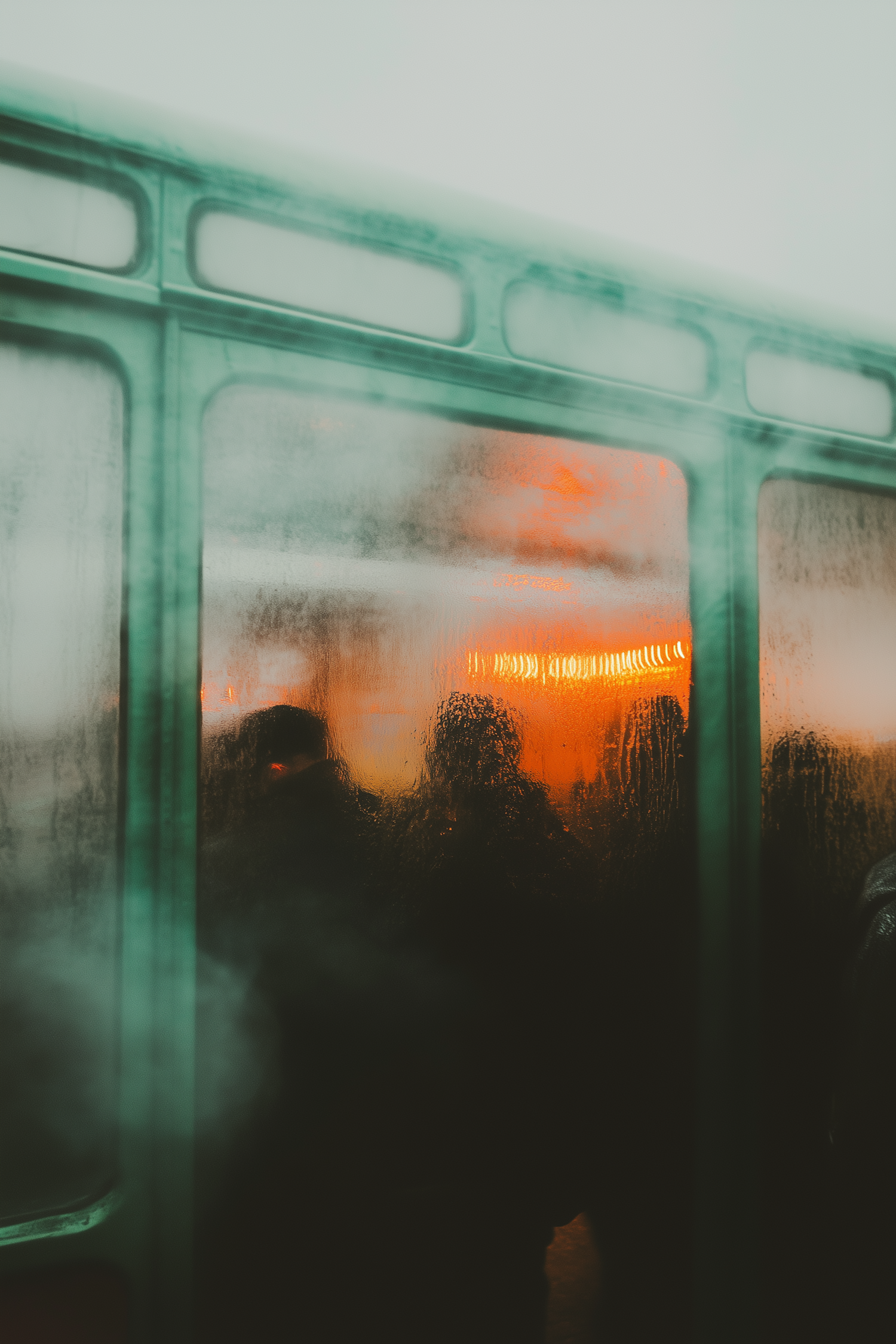 Foggy window with silhouettes of people inside a vehicle, warm orange glow contrasts with greenish frame, creating a moody atmosphere.