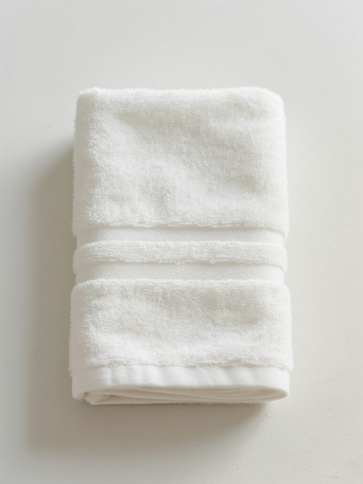 Top-down view of a white bath towel neatly folded on a plain light background, soft neutral colors, no shadows, no texture on the background, clean and minimal composition, high-resolution photography style, no text or labels