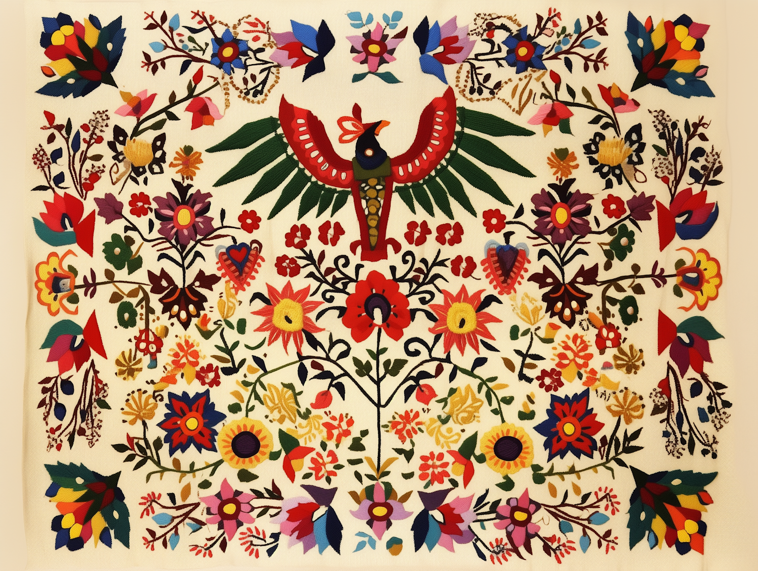 Colorful folk art embroidery with a central red bird, vibrant flowers, and intricate patterns on a cream background.
