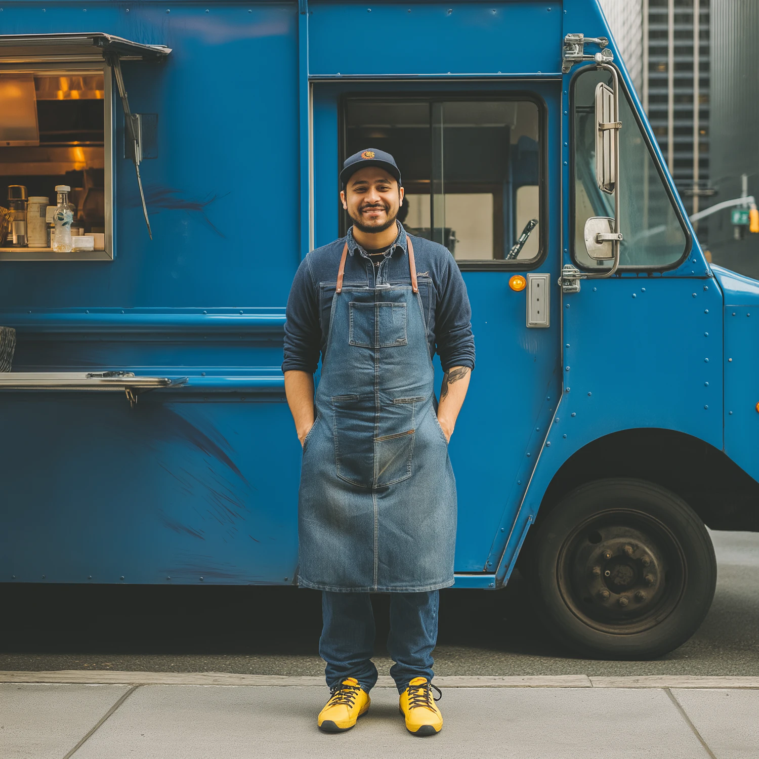 A friendly man in a denim apron stands in front of a blue food truck, ready to serve. His bright yellow sneakers add a pop of color.