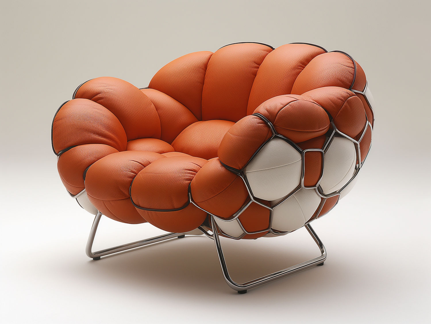 Modern chair with orange and white cushions in a geometric metal frame, offering a stylish and comfortable seating option.