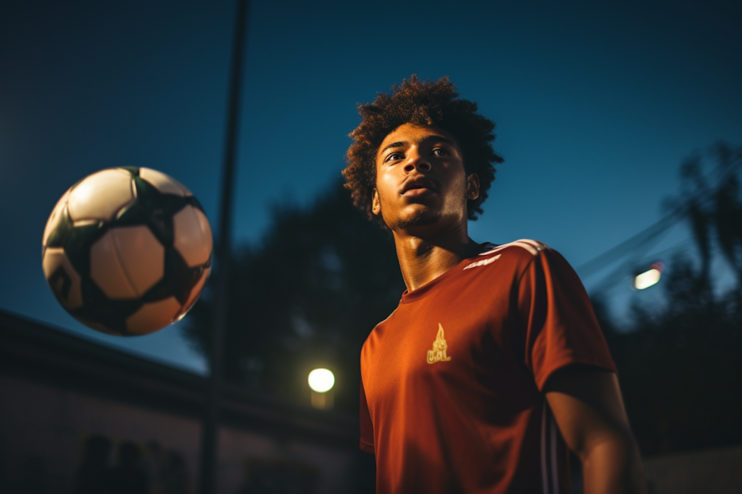 Young athlete in red jersey focuses on a soccer ball in mid-air against a deep blue evening sky, capturing a moment of anticipation.