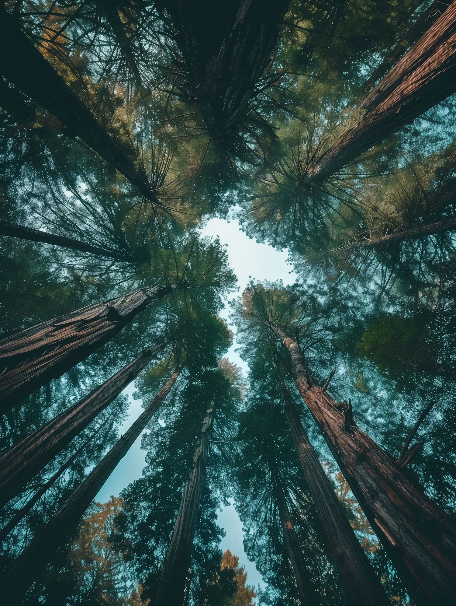 Majestic redwood trees stretch skyward, creating a serene canopy with sunlight filtering through lush green leaves.