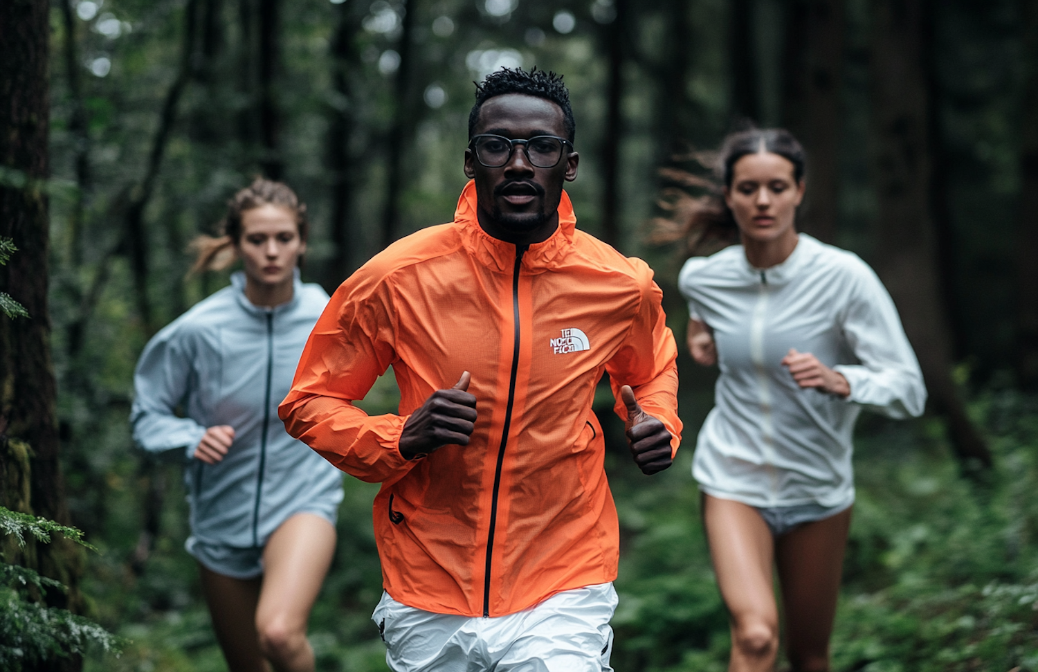 Three runners in a forest, led by a man in an orange jacket, flanked by two women in light jackets, showcasing outdoor fitness.