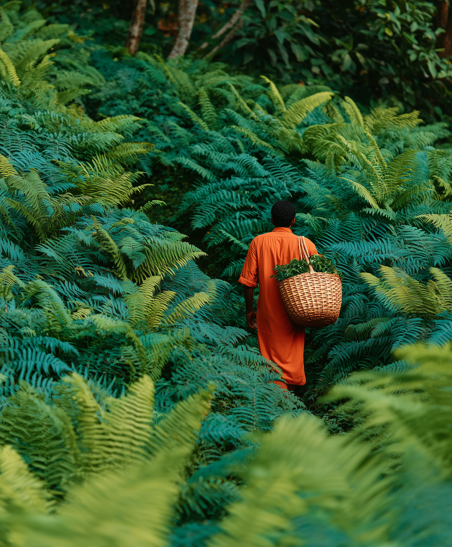 Person in orange walking through lush green ferns, carrying a basket of greenery. A serene and vibrant nature scene.
