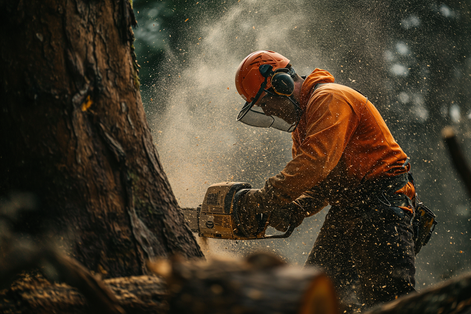 Lumberjack cutting a tree with a chainsaw, wearing protective gear. Sawdust fills the air, capturing the intensity of the work.