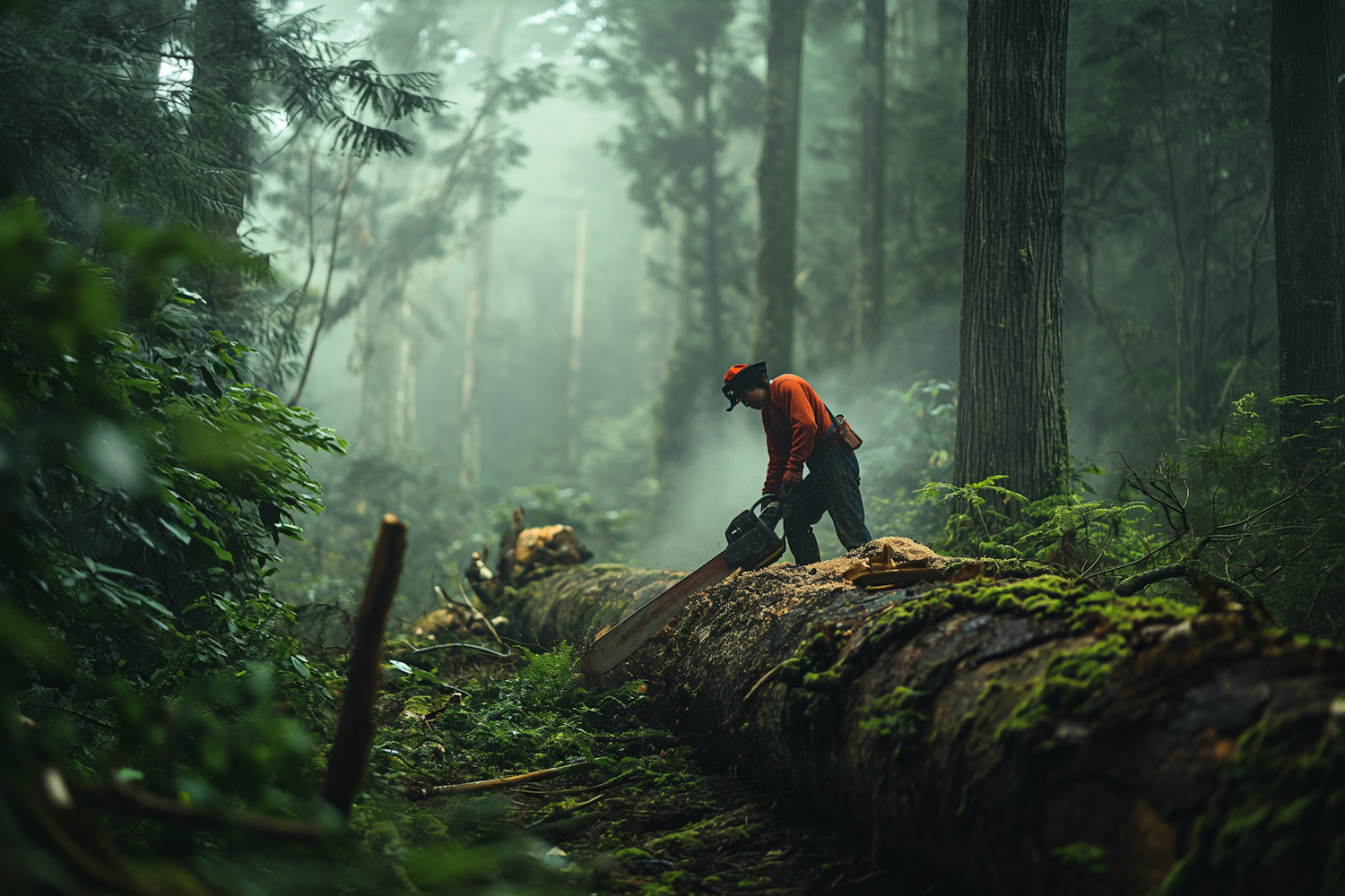 A person in a red helmet uses a chainsaw on a mossy log in a misty, dense forest, surrounded by lush greenery.