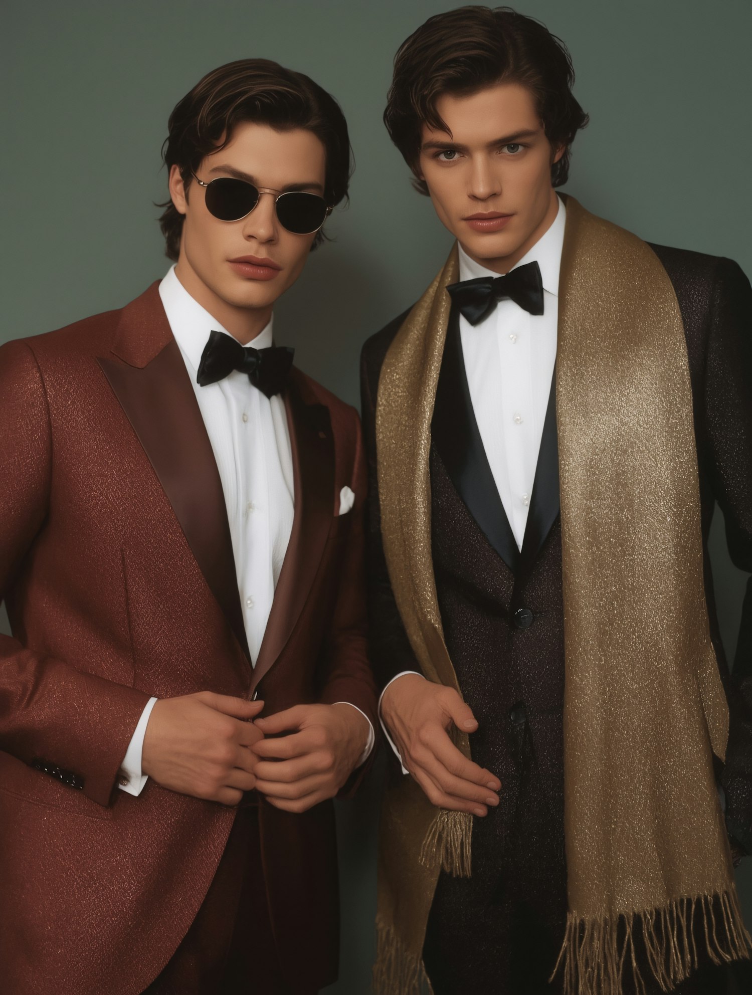 Two stylish men in formal suits, one in burgundy with sunglasses, the other in black with a gold scarf, posing confidently together.