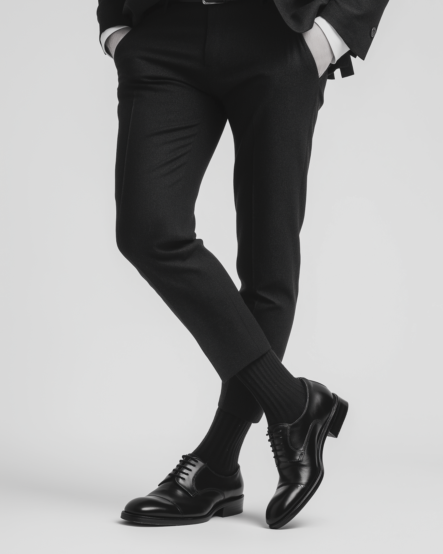 Elegant black suit with polished dress shoes and crossed legs, exuding sophistication and style in a minimalist setting.