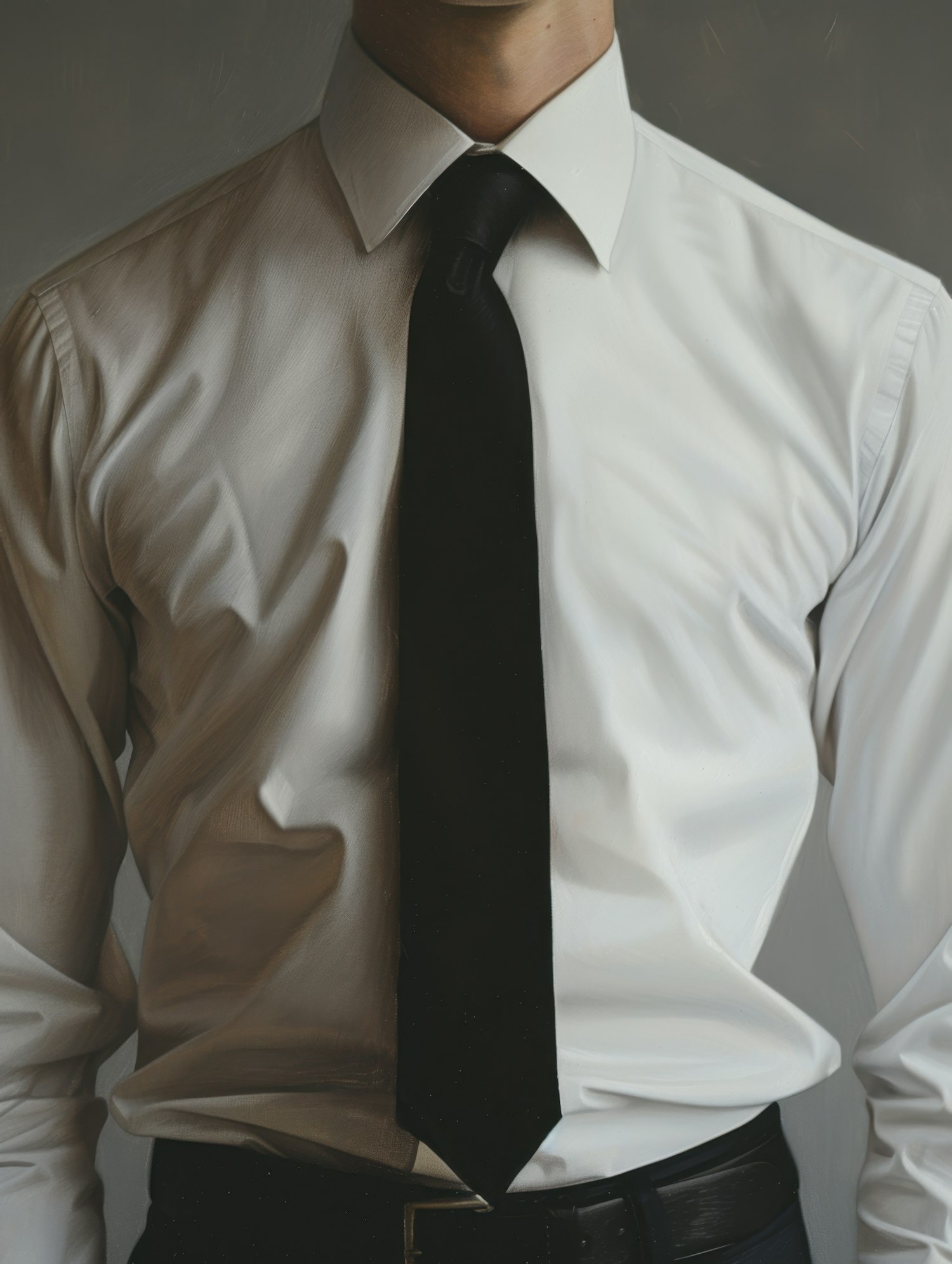 Man in a white dress shirt and black tie, showcasing formal attire with a neutral gray background.