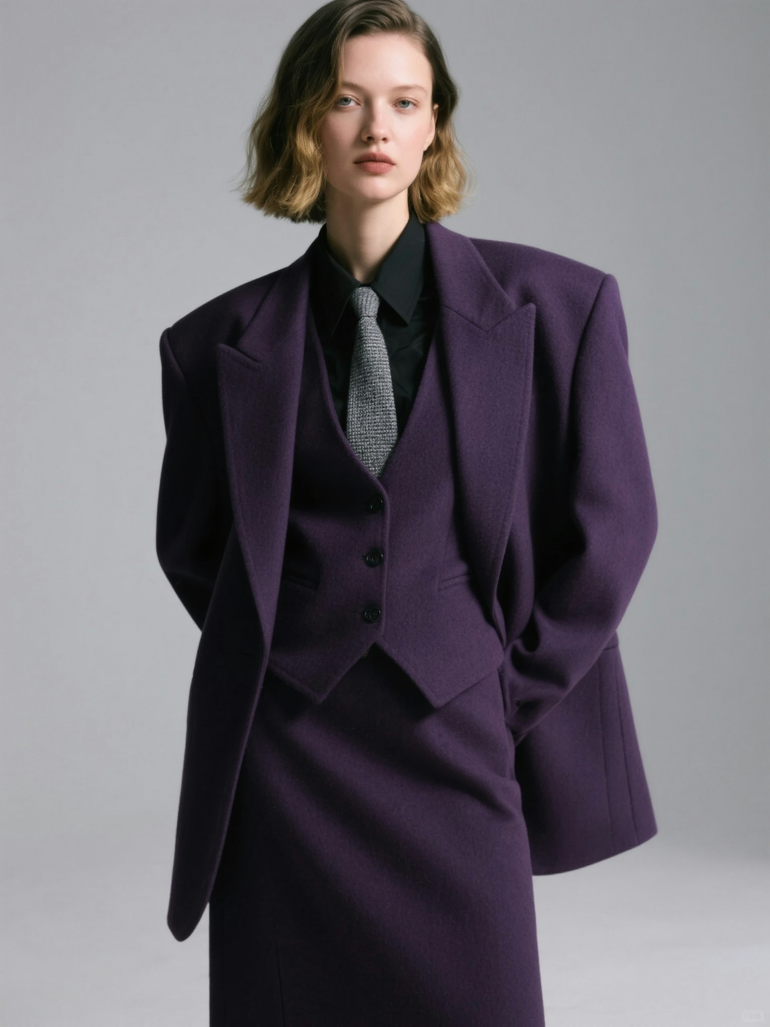 Studio fashion editorial close-up portrait of a woman with a dark blonde bob haircut, slightly wavy, exuding strength and femininity. The framing focuses on her upper body, showing the tailoring of the outfit. She is wearing an oversized very dark purple suit: a wide-shouldered blazer, a structured vest, and a matching long skirt. Underneath, she wears a fitted black shirt with a pointed collar and a textured gray tie. The fabrics appear structured and slightly heavy, emphasizing the volume and proportions of the tailoring. The background is a seamless neutral gray studio backdrop, smooth and uniform with no floor separation. Lighting is soft and evenly diffused, producing subtle shadows that define the shapes and textures of the fabrics. The art direction is minimal, modern, and editorial, focusing on presence, attitude, and the impact of deep-colored oversized tailoring.