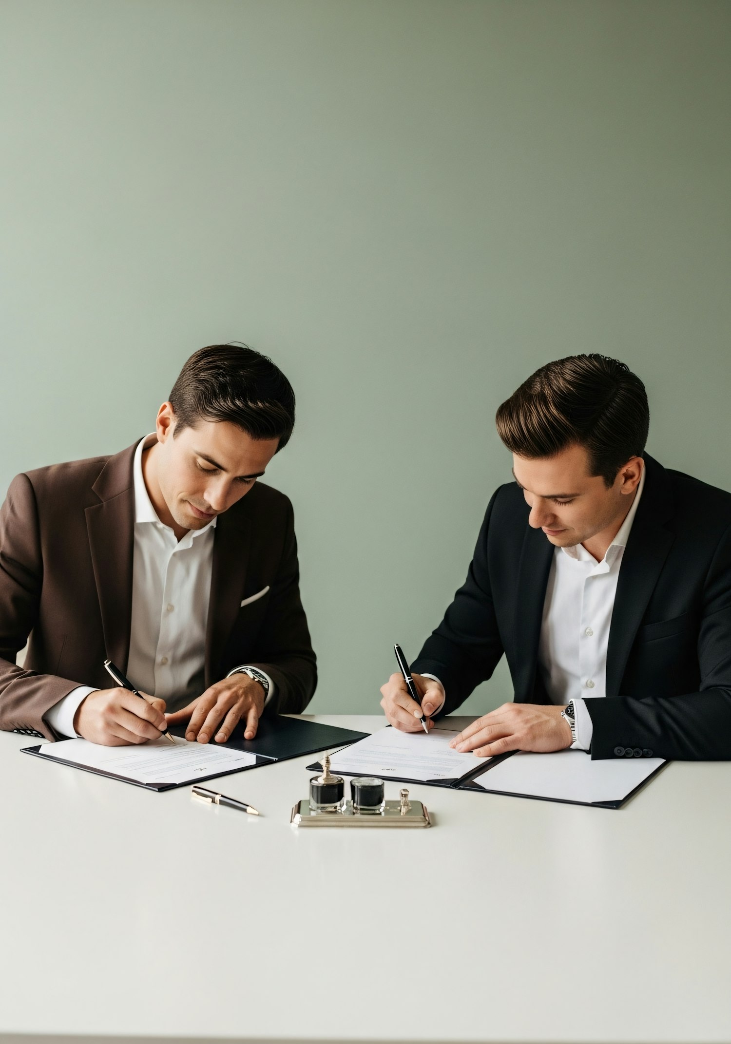 Two men in formal suits signing documents at a white table, with an ink set between them, against a muted green background.