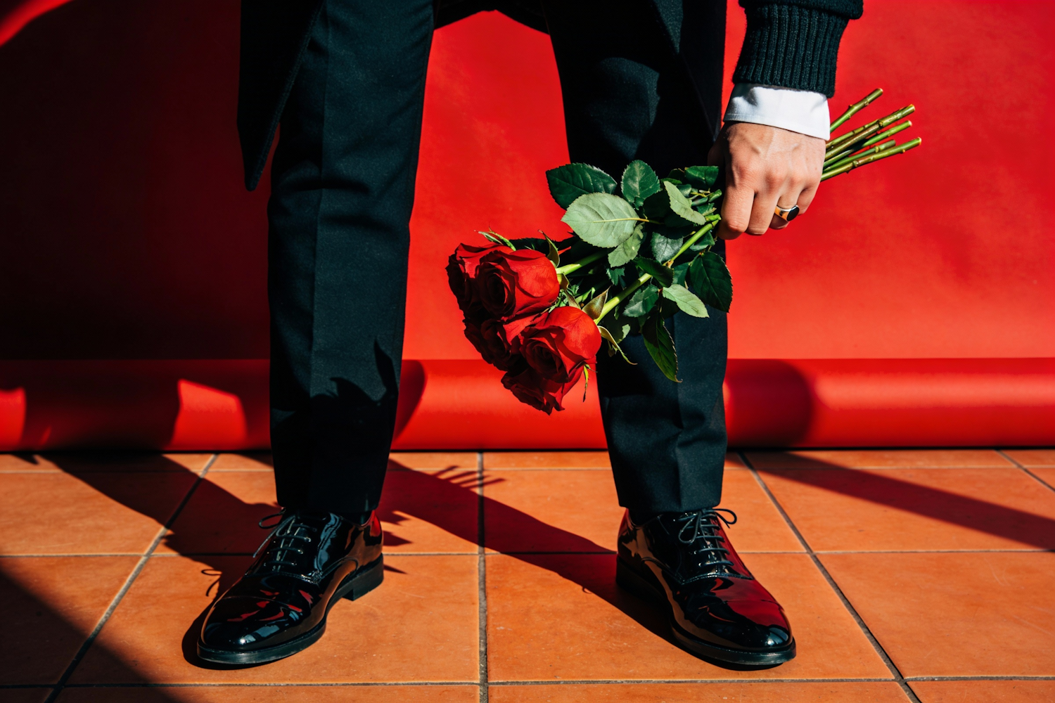 A person in formal black attire holds red roses against a bold red background, with polished shoes and a tiled floor adding contrast.