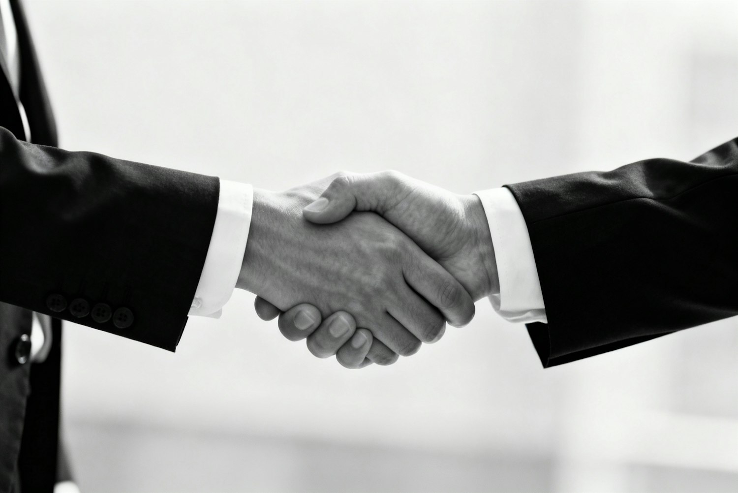 A black-and-white image of two people in suits shaking hands, symbolizing agreement or partnership in a professional setting.