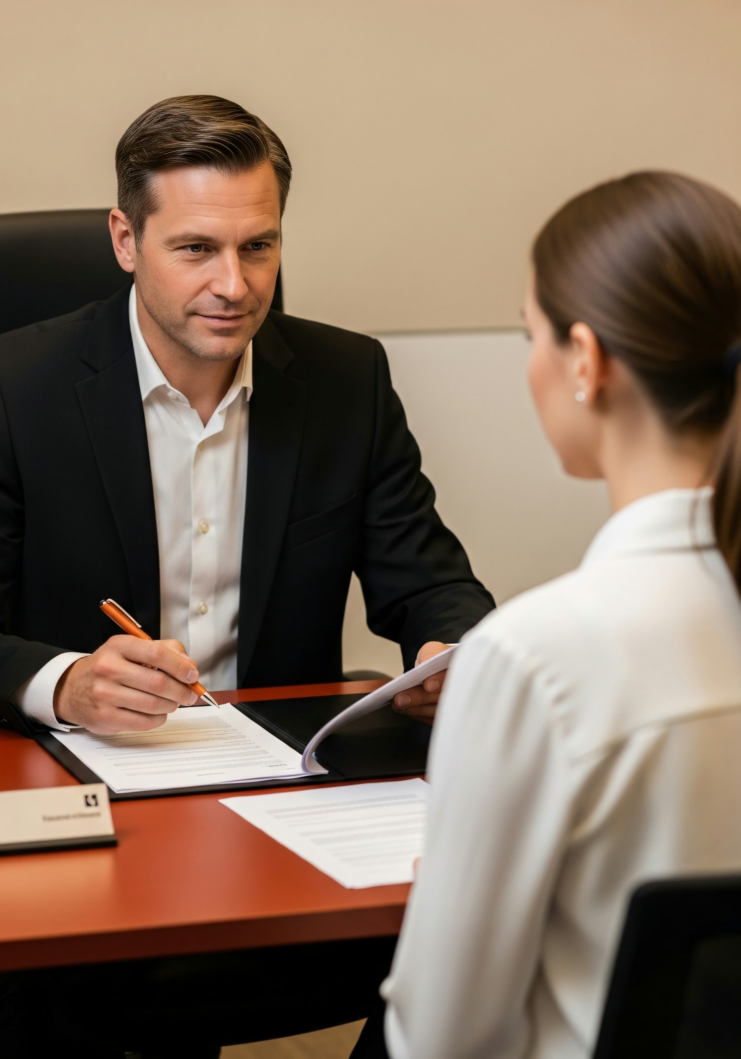 A professional meeting scene with a man in a suit and a woman in a blouse discussing documents at a desk.