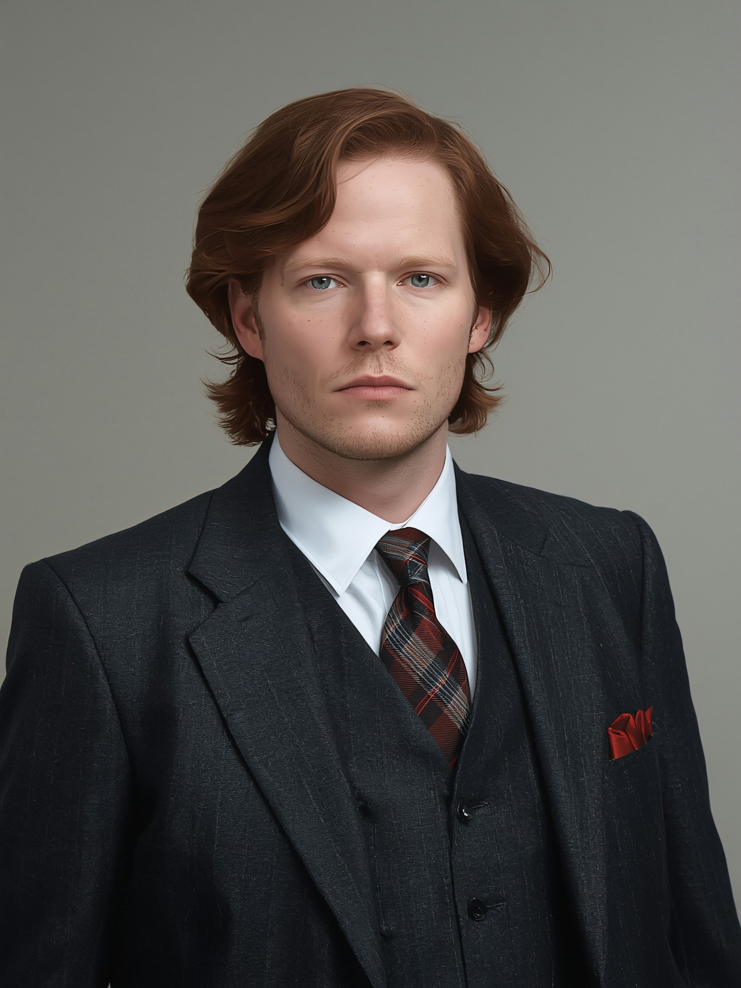 A man in a dark suit with a plaid tie and red pocket square, posing against a neutral background.