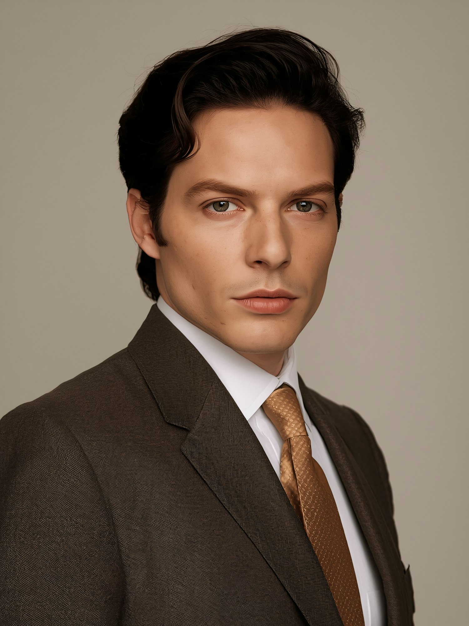 A man in a brown suit with a golden tie, clean-shaven, and dark brown hair, posing against a plain background.