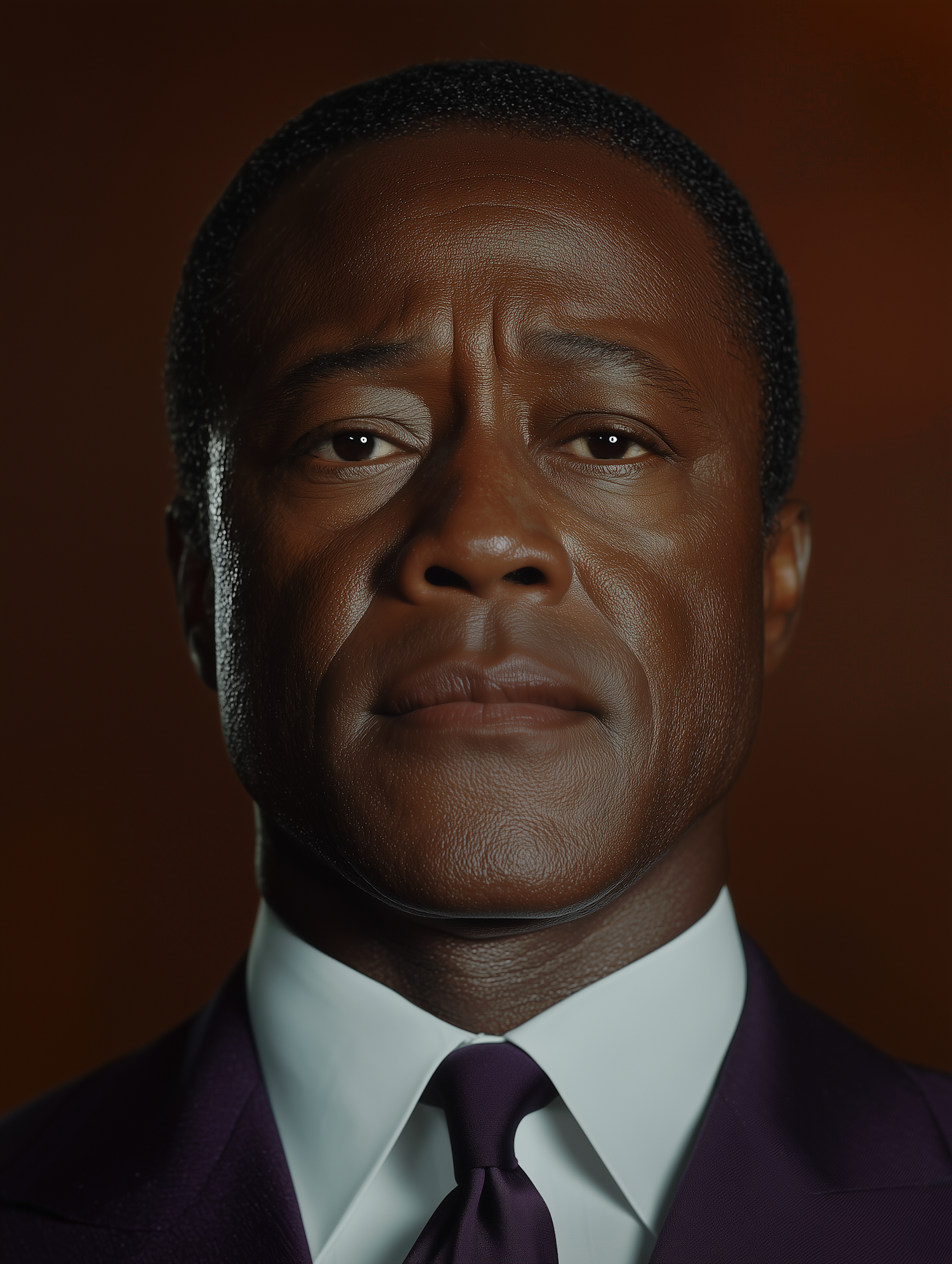 Close-up portrait of a Black man in a purple suit, with a serious expression and warm brown background.
