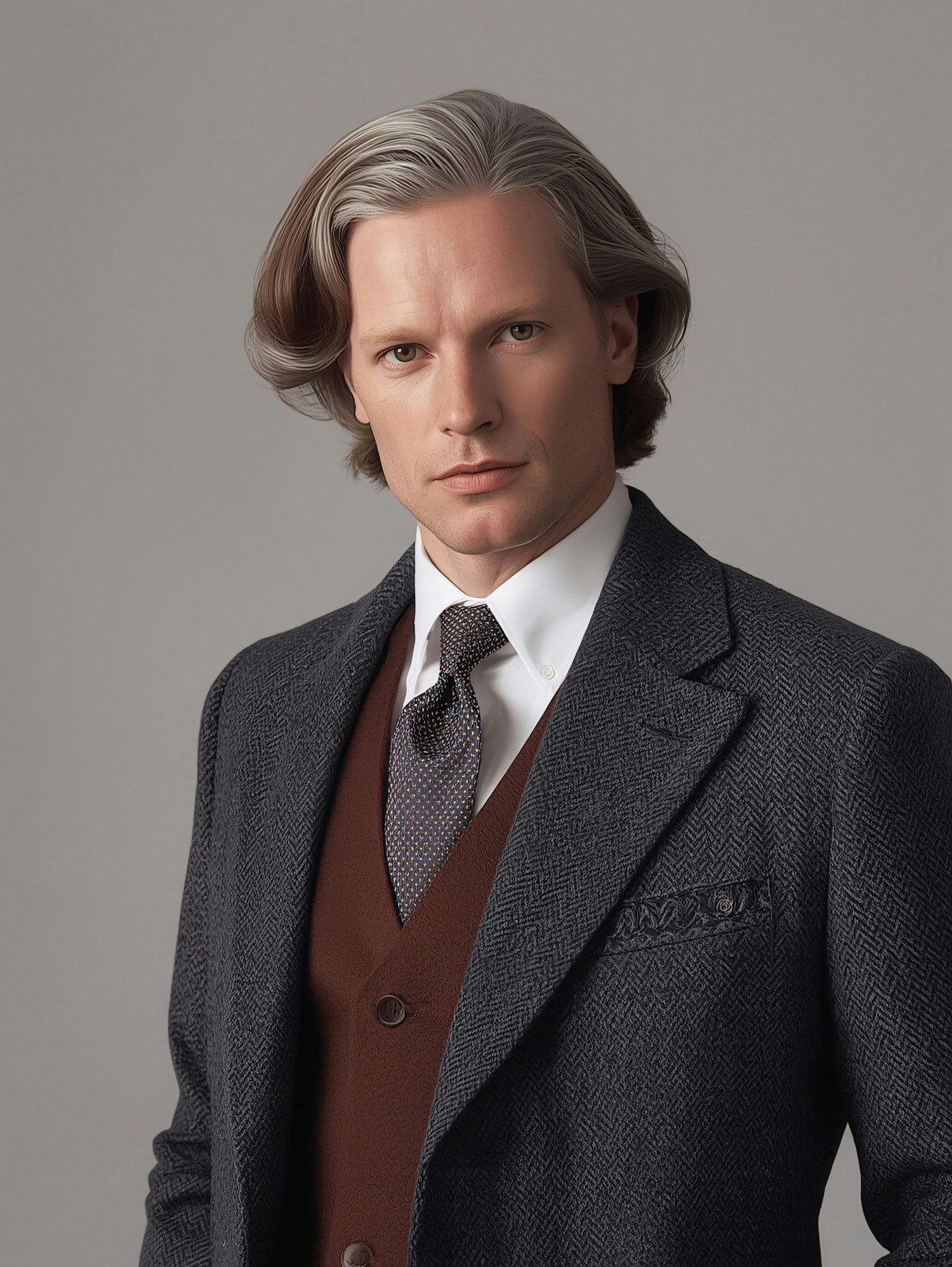 A man in a gray blazer and brown vest, with gray-streaked hair, poses against a neutral background.