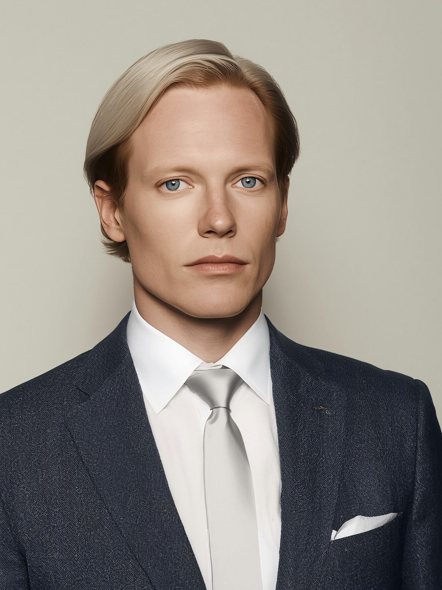 A professional portrait of a man in a dark blue suit, white shirt, and tie, set against a neutral background.
