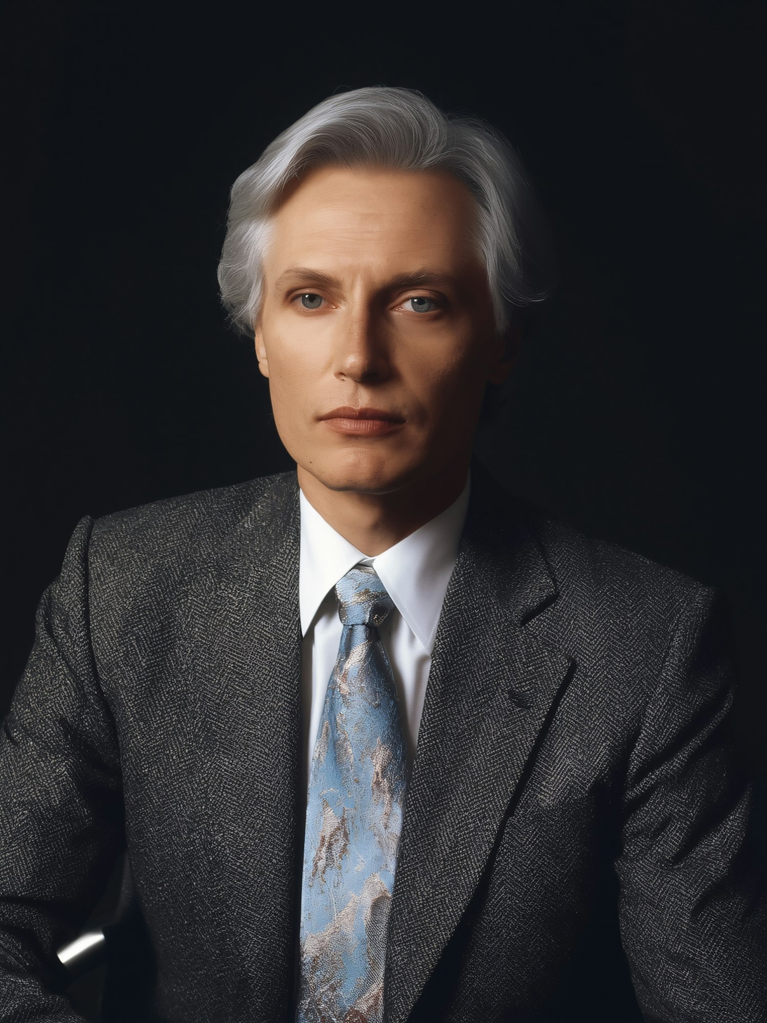 A man in a gray suit and blue tie, with silver hair, poses against a dark background, creating a professional and elegant portrait.