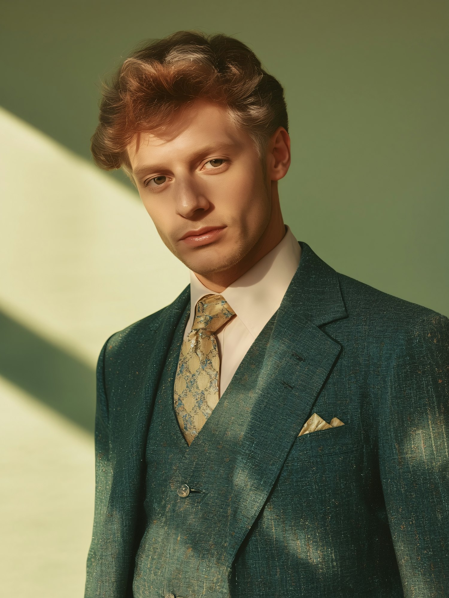 A man in a teal suit with a gold tie and pocket square stands against a softly lit green background with diagonal shadows.