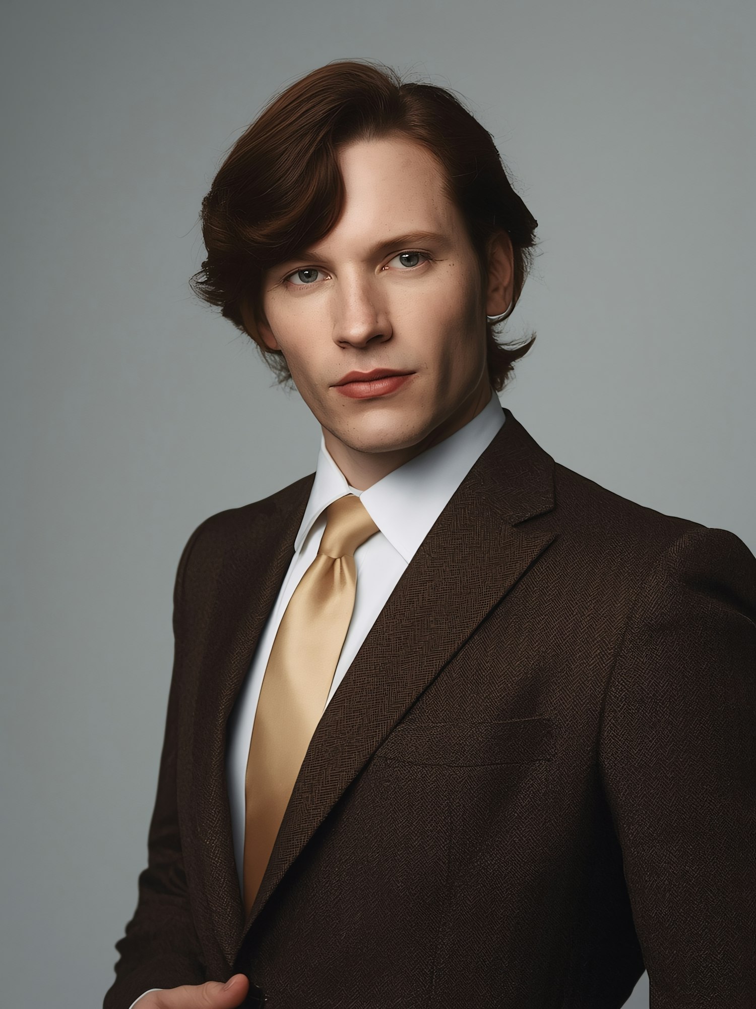 A well-dressed individual in a brown suit and gold tie, set against a neutral gray background, exuding professionalism.