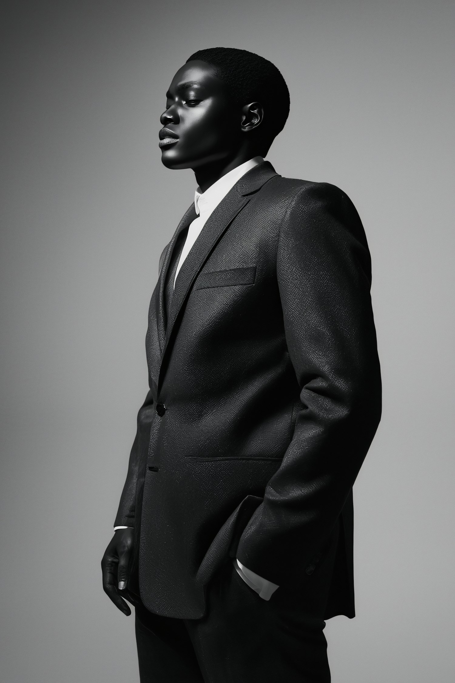 A person in a tailored black suit and white shirt, set against a neutral background, exuding professionalism and elegance.