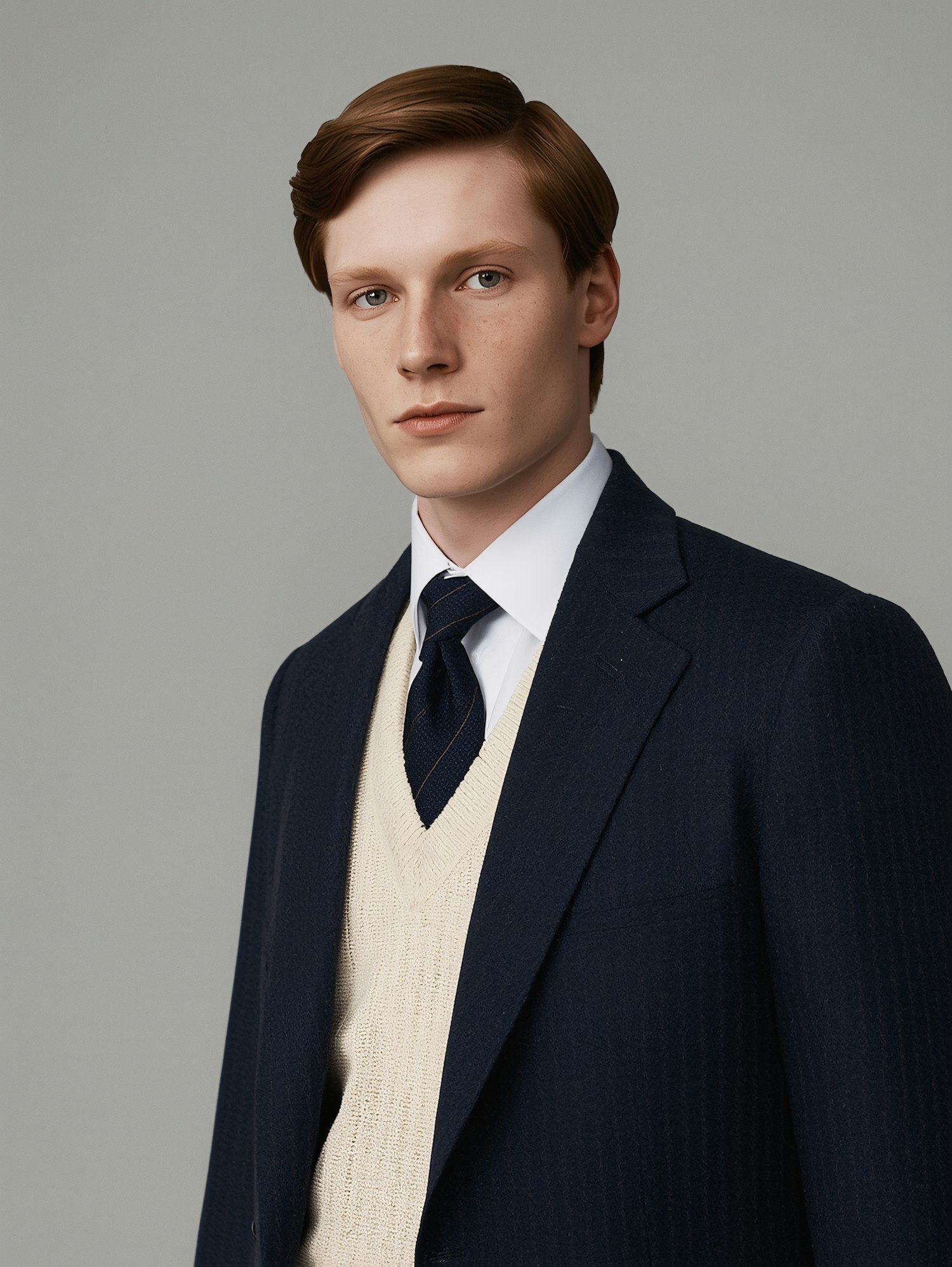 Young man in a navy suit, cream sweater vest, and tie, posing against a neutral gray background with a composed expression.