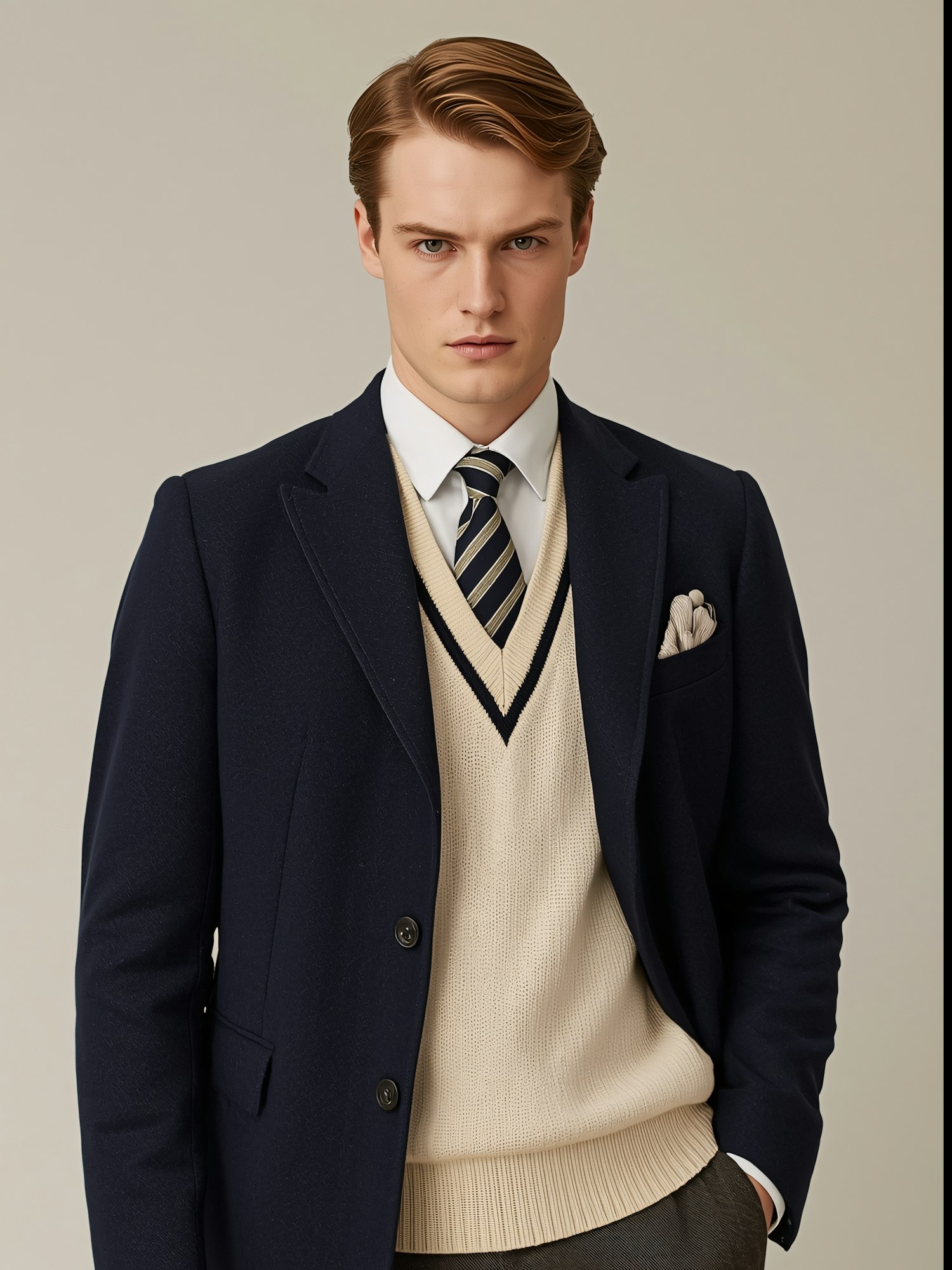 Stylish man in a navy blazer, cream sweater, and striped tie, exuding a classic and polished look against a neutral background.