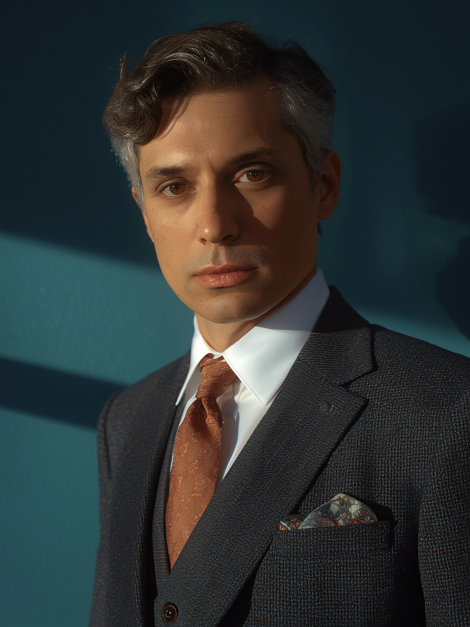 A man in a dark suit with a patterned tie and pocket square, set against a teal background with soft lighting and shadows.